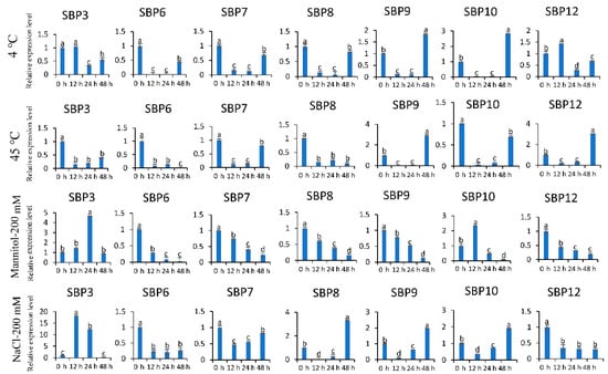 To further confirm whether different abiotic stresses influence the expression of PeSBP genes, qRT-PCR experiments were performed to analyze the SBP gene expression patterns in response to different treatments, including cold, heat, and osmotic stress. As shown in Figure 9, seven SBP genes were selected for transcription-level detection. Under cold treatment, five genes (PeSBP6/7/8/9/10) had similar expression patterns that initially decreased and subsequently increased during the course of the treatment, while the relative expression level PeSBP3/12 first increased and then decreased with the treatment time. During the heat treatment, three genes (PeSBP3/6/8) showed a continuous decrease with the treatment time, and the other four genes (PeSBP7/9/10/12) first decreased and then increased their expression with the treatment time.