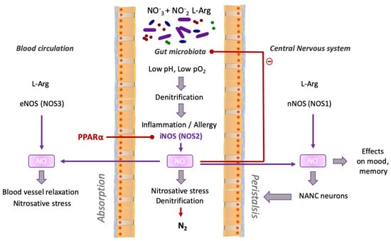 Notably, PPARα and its agonists have been found to participate in the regulation of the activity of NOS, which should also affect the gut microbiota. In particular, both natural and synthetic PPARα agonists inhibit the expression of NOS2 gene, while facilitating NOS 1 and NOS 3 production. The stationary level of NO may affect the microbiota, as being a substrate for denitrification, but also as a strong antibacterial factor. Here, it should be noted that NOS in the absence of L-Arg turn into the effective producers of superoxide O2−. Superoxide anion is also generated during the neutrophil and macrophage oxidative burst, leading to the appearance of more toxic nitrosative agents, e.g., peroxinitrite, ONOO− [].