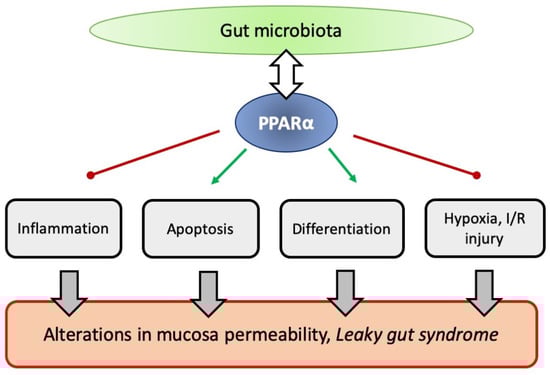Epithelial cells of a healthy gut operate in the steep oxygen gradient both in small intestine and, especially, in the colon. Enterocytes outside crypts are subjected to “physiological hypoxia” as their environment is characterized by much lower oxygen tension than elsewhere in the body (as low as 10 mmHg O2 in the colon) []. Hypoxia-evoked stabilization of hypoxia-inducible factors (HIF-1α and HIF-2) in the intestinal epithelium is linked to the maintenance of TJ organization and effective barrier formation by regulation of some TJ proteins such as claudin []. Simultaneously, complete local intestinal hypoxia (ischemia) related to various traumatic events lasting for prolonged period of time (the range of hours) and followed by reperfusion (I/R injury) is known to increase gut permeability both in vivo and in vitro in HIF-dependent manner (e.g., Caco-2 monolayer Trans Epithelial Resistance, TEER, is decreased upon experimental I/R procedure) []. The question emerges whether the activation of PPARα modulates intestinal barrier function connected to these two events: inflammation (sterile or infectious) and hypoxia. This concept has been partially addressed above (Section 2 and Section 3) in regard to the interaction between microbiota and gut mucosa.