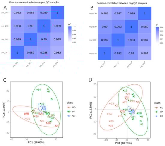The quality control of untargeted metabolic profiling. (A,B). Pearson correlation analysis between QC samples: the coefficient (R2) values were both nearly 1 under the positive (A) or negative (B) polarity modes; (C,D). PCA analysis: QCs tightly aggregated into a cluster in the positive (C) and negative (D) ion modes.