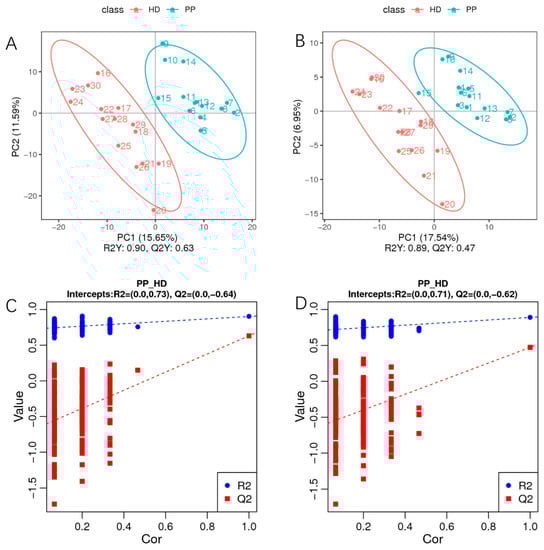 The partial least squares discrimination analysis (PLS-DA) of differential metabolites of endometrium in dogs with pyometra and healthy dogs. (A,B). The scattered plot: the classification parameters (R2Y) were 0.90 and 0.89 in positive (A) and negative (B) ionization modes; (C,D). The sorting inspection plot: the intercept values of R2 and Q2 were (0.0, 0.73) and (0.0, −0.64) in positive mode (C) and (0.0, 0.71) and (0.0, −0.62) in negative mode (D).