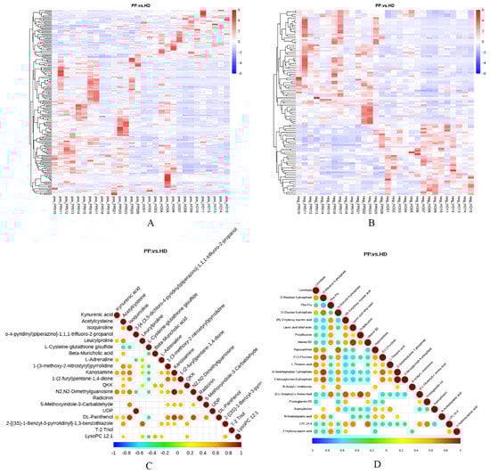 Correlation analysis of differential metabolites of endometrial tissues between dogs with pyometra and healthy dogs. (A,B). Heat map visualization of differential metabolites in the positive (A) and negative (B) modes; (C,D). Correlation diagram of differential metabolites in the positive (C) and negative (D) modes.
