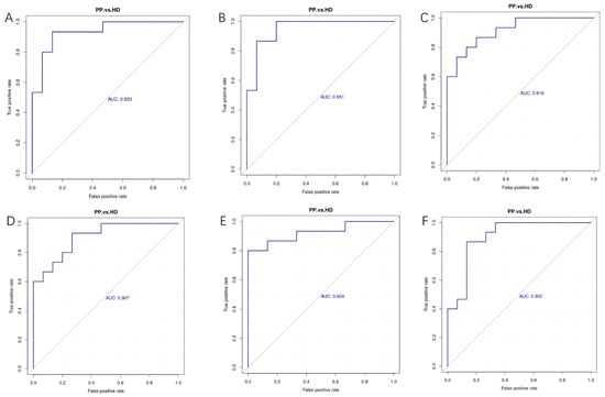 The receiver operating characteristic (ROC) curves analysis of differential metabolites. (A–F). AUC values of Tributyl citrate (A), Kynurenic acid (B), Acetylcysteine (C) and Isoquinoline (D) in the positive mode, and Phe-Pro (E), D-Glucose 6-phosphate (F) in the negative mode were all more than 0.9.