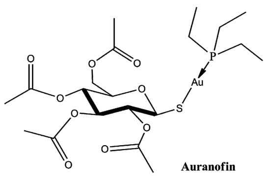 Auranofin (AF) is an FDA-approved drug for the treatment of rheumatoid arthritis [1] that has shown potent anticancer activity against many cancer cell lines [2,3,4]. Currently, it is being evaluated in phase I/II clinical trials for ovarian cancer [4], lung cancer [5] and leukemia [6]; its efficacy against the SARS-CoV-2 disease is also under consideration [7,8]. The drug complex consists of two parts: a water-soluble aurothioglucose entity with a sulfur donor group and a phosphine ligand that provides lipophilicity (Figure 1).