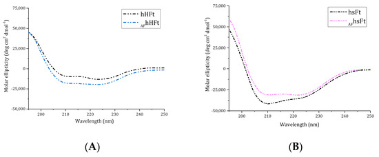 Far UV-CD spectra of AFhHFt ((A), light blue dashes) and AFhsFt ((B), pink dashes) in comparison to the spectra of the respective gold-free proteins (black dashes).