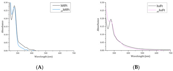 It has been reported that an absorption increase in the region between 250 and 280 nm in the UV-vis spectrum of Fts indicates successful drug encapsulation [23]. For this reason, the UV-vis spectra of the AF-loaded nanocomposites were registered and compared with those of the respective drug-free Fts (Figure 3A,B). Different results were obtained for the two preparations. AFhsFt showed a significant absorbance increase between 250 and 280 nm when compared to the AF-free protein (Figure 3B), while only a slight variance of the absorbance occurred when the spectrum of AFhHFt was compared with that of hHFt (Figure 3A). This difference may be associated with a variation in the drug loading ability of the two Fts.