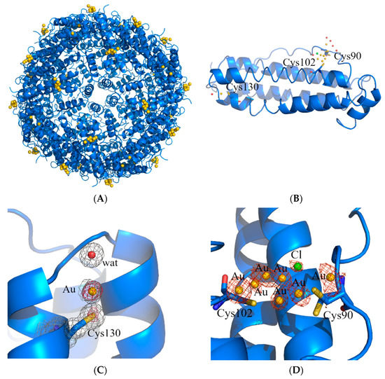 Cartoon representation of the structure of the cage (A) and of the single protein chain (B) of AFhHFt. The gold binding sites are shown in panels (C,D), and 2Fo–Fc and anomalous electron density maps are contoured at 1.0 σ (grey) and 3.0 σ (red), respectively.
