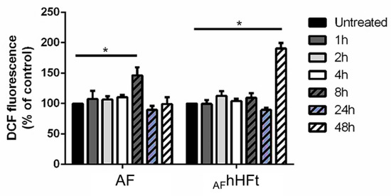 Time-course experiment to determine the effect of AF and AFhHFt on intracellular ROS levels of A431 cells. Cells were incubated in presence of both AF and AFhHFt for 1 h (dark grey bars), 2 h (light grey bars), 4 h (white bars), 8 h (dashed dark grey bars), 24 h (dashed blue bars), 48 h (dashed white bars). Black bars refer to the untreated cells. The fluorescence intensity of the probe is related to the intracellular ROS level and is reported as a percentage of untreated cells (%). Data shown are the means ± S.D. of three independent experiments and * indicates p < 0.05 with respect to untreated cells.