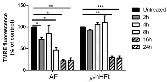 It is known that mitochondria are sensitive to changes in the cellular redox status and ROS activation is known to induce the depolarization of the mitochondrial membrane [29]. For this reason, the mitochondrial membrane potential of A431 cells upon AF and AFhHFt treatment was measured via a TMRE assay [30] over time (Figure 7). A431 cells were incubated for 2, 4, 8, 16 and 24 h with an amount of AF and AFhHFt corresponding to their IC50 values. In both cases, treatment resulted in the dissipation of the mitochondrial membrane potential (Δψm). However, for the free drug, a decrease in fluorescence intensity was observed already after 8 h incubation; whereas a strong depolarization started to occur after 16 h when cells were treated with AFhHFt. The lowest permeability threshold found after 16 h of treatment remained constant up to 24 h of incubation. This implies mitochondrial damage during treatment with AF and AFhHFt.