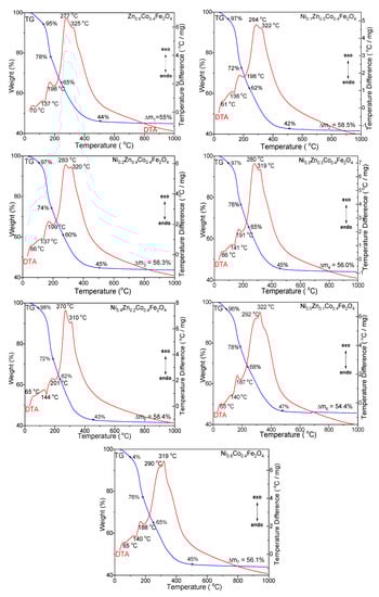 The exothermic peak, characteristic of the decomposition of divalent metal succinates, decreases with the increasing Zn content and shifts toward higher temperatures, leading to the increase of the exothermic peak, attributed to the decomposition of the Fe succinates. The SiO2 matrix suffers various transformations during the thermal process, making the demarcation of the processes attributed to the formation and decomposition of succinate precursors difficult []. The total mass loss increases in the following order: Ni0.5Zn0.1Co0.4Fe2O4@SiO2 < Zn0.6Co0.4Fe2O4@SiO2 < Ni0.3Zn0.3Co0.4Fe2O4@SiO2 < Ni0.6Co0.4Fe2O4@SiO2 < Ni0.2Zn0.4Co0.4Fe2O4@SiO2 < Ni0.4Zn0.2Co0.4Fe2O4@SiO2 < Ni0.1Zn0.5Co0.4Fe2O4@SiO2.