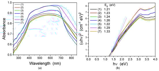 (a) UV-Vis absorption spectra and (b) Tauc’s plot of the of Zn0.6Co0.4Fe2O4@SiO2 (1), Ni0.1Zn0.5Co0.4Fe2O4@SiO2 (2), Ni0.2Zn0.4Co0.4Fe2O4@SiO2 (3), Ni0.3Zn0.3Co0.4Fe2O4@SiO2 (4), Ni0.4Zn0.2Co0.4Fe2O4@SiO2 (5), Ni0.5Zn0.1Co0.4Fe2O4@SiO2 (6) and Ni0.6Co0.4Fe2O4@SiO2 (7) samples at 1000 °C.