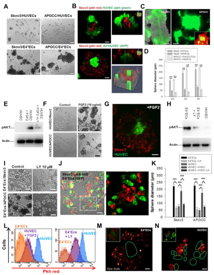 (A) Spheroids of SKOV3 and APOCC co-cultured with HUVECs or E4 + ECs were grown in 3D media for 6 days. Scale bar, 50 µm. (B) SKOV3 cells were stained with PKH red prior to being co-cultured with HUVECs stained with PKH green (top panel) or eGFP-E4 + ECs (bottom panel). Z-X reconstitution is shown on the right. Top scale bar, 10 µm. Bottom scale bar, 30 μm. (C) SKOV3 (left panel) and APOCC (right panel) were co-cultured with eGFP-E4 + ECs. eGFP fluorescence was revealed in epifluorescence. Scale bar, 20 µm. (D) Spheroids of SKOV3 cells and APOCC co-cultured with HUVECs or co-cultured with E4 + ECs were grown for 6 days. Spheroid diameters were measured at D2, D3 and D5. p < 0.001 (***). (E) Western blot of pAkt on untreated HUVECs, HUVECs treated with FGF2 and HUVECs treated with FGF2 + LY 294002. Actin was used as control. (F) Spheroids of SKOV3 cells and APOCC co-cultured with HUVECs pre-treated or not with FGF2 (10 ng/mL) were grown for 6 days. Scale bar, 50 µm. (G) SKOV3 cells were stained with PKH red prior to being co-cultured with HUVECs stained with PKH green and treated with FGF2 (10 ng/mL). Scale bar, 30 μm. (H) Western blot of pAkt on E4 + ECs, E4 + ECs treated with LY 294,002 and HUVECs. Actin was used as control. (I) Spheroids of SKOV3 cells and APOCC co-cultured with E4 + ECs pre-treated or not with LY 294,002 (10 µM) were grown for 6 days. Scale bar, 50 µm. (J) SKOV3 cells were stained with PKH red prior to being co-cultured with eGFP-E4 + ECs treated with FGF2 (10 ng/mL). Scale bar, 15 μm. (K) The bar graph represents the sphere diameters at D6 for the different co-culture conditions of SKOV3 and APOCC with HUVECs or E4 + ECs. (L) SKOV3 cells were stained with PKH red prior to being co-cultured with HUVEC, HUVEC treated with FGF2 (10 ng/mL), E4 + ECs or E4 + ECs treated with LY 294,002 (10 µM). PKH level was evaluated by flow cytometry. (M,N) SKOV3 cells were stained with PKH red prior to being co-cultured with eGFP-E4 + ECs (M) and with HUVECs stained with PKH green (N). Pictures are shown in glow scale. Scale bar, 50 µm (M) and 20 µm (N). Green circles represent the location of eGFP-E4 + ECs or HUVECs stained with PKH green. (B,G,J,M,N): pictures were taken via confocal imaging.