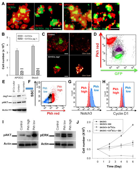 (A) Spheroids of SKOV3 and APOCC were stained with PKH red prior to being co-cultured in 3D media with eGFP-E4 + ECs or eGFP-SH-jag1-E4 + ECs. Pictures were taken via confocal imaging. Scale bar, 100 μm. (B) The bar graph represents the sphere diameters at D6 for co-cultures of OCCs (SKOV3 and APOCC) and eGFP-E4 + ECs or eGFP-SH-jag1-E4 + ECs. p < 0.001 (***). (C) SKOV3 cells were stained with PKH red prior to being co-cultured in 3D media with eGFP-E4 + ECs (top pictures) or eGFP-SH-jag1-E4 + ECs (bottom pictures). Pictures with glow scales were taken via confocal imaging. Scale bar, 50 µm (D) SKOV3 cells were stained with PKH red prior to being co-cultured in 3D media with eGFP-E4 + ECs. eGFP-E4 + ECs in contact with SKOV3 (purple population) or not in contact (green population) were sorted at D6. (E) Western blotting for Jag1 and pAkt was performed on sorted E4 + ECs. Actin was used as control. (F) SKOV3 cells were stained with PKH red prior to being co-cultured in 3D media with eGFP-E4 + ECs. After 6 days of co-culture, PKH low SKOV3 (blue population) and PKH high SKOV3 (red population) were sorted. g-h Notch3 (G) and Cyclin D1 (H) were evaluated in the two SKOV3 populations sorted in F by flow cytometry. (I) Western blotting for pERK and pAkt was performed on sorted SKOV3. Actin was used as control. (J) Spheroids of SKOV3 with or without E4 + ECs were cultured in the presence or not in the presence of GSI for 6 days. Every 2 days, SKOV3 cells were counted.