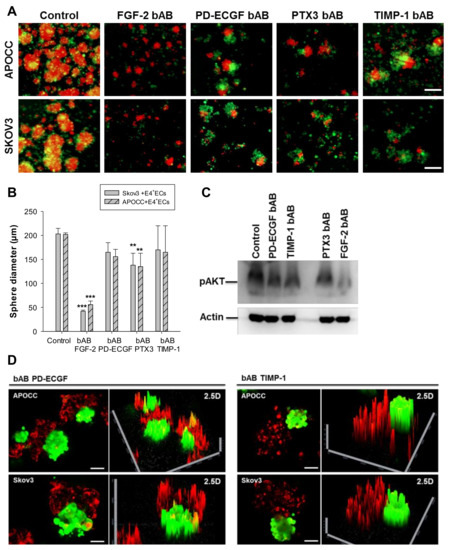 (A) Spheroids of SKOV3 and APOCC were stained with PKH red prior to being co-cultured in 3D media with eGFP-E4 + ECs. Spheroids were cultured for 6 days in the presence of different blocking antibodies (FGF-2 bAB, PD-ECGF bAB, PTX3 bAB and TIMP-1 bAB). Scale bar, 250 µm. (B) The bar graph represents the sphere diameters at D6 for the different conditions of the co-cultures of OCCs (SKOV3 and APOCC) and eGFP-E4 + ECs. p < 0.01 (**), p < 0.001 (***). (C) Western blotting for pAkt was performed on E4 + ECs treated or not treated with the different bABs. Actin was used as control. (D) Spheroids of SKOV3 and APOCC were stained with PKH red prior to being co-cultured in 3D media with eGFP-E4 + ECs. Spheroids were cultured for 6 days in the presence of different blocking antibodies (PD-ECGF bAB and TIMP-1 bAB). Confocal imaging was performed on the spheroids and 2.5D reconstructions are displayed. Scale bar, 200 µm.
