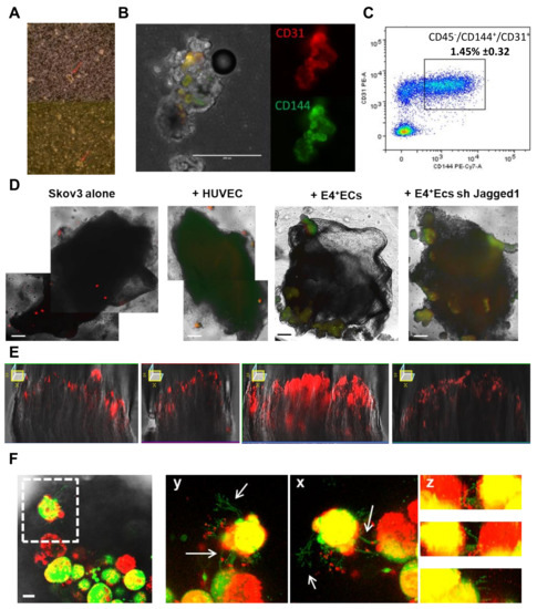 (A) Ascites of patients were screened through phase microscopy for spheroid formations (red arrow). (B) Spheroids from patient ascites were stained with CD31 and CD144. Scale bar, 200 µm. (C) Cells from patient ascites were stained with CD45, CD144 and CD31 and CD45-/CD144+/CD31+ cells were gated. The full gating strategy is available in Supplementary Figure S9. (D) SKOV3 cells were stained with PKH red prior to being co-cultured in 3D media with HUVECs stained with PKH green, eGFP-E4 + ECs or eGFP-SH-jag1-E4 + ECs. After 6 days of co-culture, spheroids were put in contact with patient peritonea pieces. Scale bar, 500 µm (E) Z-X reconstitution of red fluorescence is shown for each condition. (F) Pictures display confocal imagery taken deep in peritonea in contact with spheroids of SKOV3 and eGFP-E4 + ECs. Arrows are pointing at endothelial sprouting coming from eGFP-E4 + ECs. Scale bar, 20 µm.