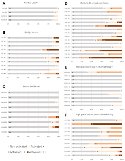 Samples from patients who had a suspected ovarian tumor were collected during debulking surgeries. After the histological material was fixed, sectioned and colored, it was analyzed under microscope. Immunohistochemistry S-P assays were used to investigate the expression of pAkt. The stacked bar graphs show the level of pAkt staining per patient sample identified in normal ovary (A), benign serous (B), serous borderline tumor (C), high-grade serous carcinoma (D), high-grade serous pre-chemotherapy carcinoma (E) and high-grade serous post-chemotherapy carcinoma (F). Vessels were considered as activated +, ++ or +++ depending on the staining intensity.