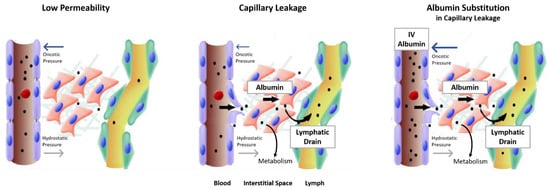 Albumin flux during various conditions. The size of the arrows reflects the direction and sizes of pressures and albumin fluxes. Adapted with permission from Ref. []. Copyright © 2022, Springer Nature.