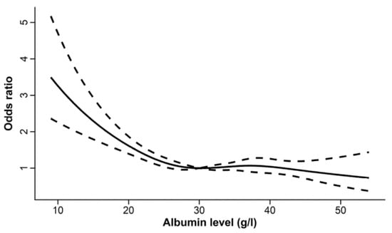 The relationship between serum albumin level and the risk of ICU mortality assessed by restricted cubic splines in a retrospective cohort study of 18,353 patients from the Medical Information Mart for Intensive Care IV (MIMIC-IV) database. The odds ratio of mortality is shown on the y-axis. The risk of mortality increases progressively when initial serum albumin levels are lower than 30 g/L. Reproduced without modification from Jin et al. 2022 [] (accessed on 22 October 2022), under a Creative Commons Attribution 4.0 International (CC BY) License (https://creativecommons.org/licenses/by/4.0/ accessed on 22 October 2022). Copyright © 2022, The Authors. This reuse has not been endorsed by the licensor. The source reference is “[]” and is available at https://www.frontiersin.org/articles/10.3389/fnut.2022.770674/full, accessed on 13 November 2022.