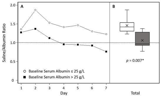 The ratios of saline to albumin were not reported in the post hoc publication on the role of baseline hypoalbuminemia in SAFE and are therefore shown here. The mean resuscitation fluid volumes administered per day for the first seven days by the treatment group and baseline serum albumin concentration given in Ref. [], as shown in Table S1, were used to calculate saline-to-albumin ratios. The mean saline-to-albumin ratio for days 1–7 was significantly higher in the group of patients with a baseline serum albumin concentration of 25 g/L or less than in the patient group with a serum albumin level of more than 25 g/L (Mann–Whitney U test n = 7, mean ± SD = 1.45 ± 0.211 vs. 1.05 ± 0.214, p = 0.007) (Figure 4). These data strongly suggest that the volume effects of IV albumin are likely to be stronger in hypoalbuminemia than in normal serum albumin levels.