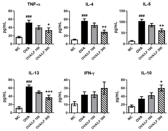 2.2. LF Suppressed the Production of OVA-Induced Typical Th2 Cytokines and Increased Anti-Inflammatory Cytokines in the BALF