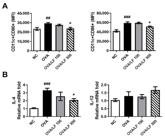 2.5. LF Downregulated the Surface Molecules CD80 and CD86 in DCs in the Spleen of OVA-Treated Mice