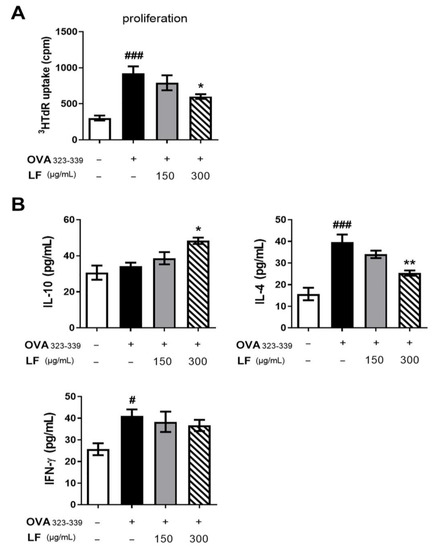 2.6. LF Decreased the Capacity of DCs to Stimulate OVA-Specific Th2-Cell Responses In Vitro