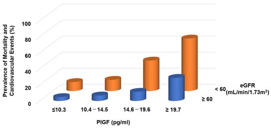 - Matsui, M.; Takeda, Y.; Uemura, S.; Matsumoto, T.; Seno, A.; Onoue, K.; Tsushima, H.; Morimoto, K.; Soeda, T.; Okayama, S.; et al. Placental Growth Factor as a Predictor of Cardiovascular Events in Patients with CKD from the NARA-CKD Study. J. Am. Soc. Nephrol. 2015, 26, 2871–2881. [Google Scholar] [CrossRef] [PubMed]