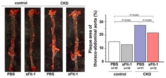 An in vivo experiment using 5/6-nephrectomized Apo E knockout (KO) mice showed that mRNA and plasma levels of sFlt-1 were decreased but those of PlGF were increased compared with the control Apo E KO mice [,]. The CKD model mice had more areas with severe plaque in the thoracoabdominal aorta and aortic root, with massive infiltration of macrophages into the plaques. These atherosclerotic lesions were positively related to plasma levels of indoxyl sulfate and p-cresol []. Treatment with AST120, an oral carbon adsorbent of uremic toxins, was inversely related to atherosclerosis in CKD model mice and was also associated with an increase in sFlt-1 production. Additionally, repeated administration of recombinant human sFlt-1 comprising the first three immunoglobulin-like domains of the extracellular region of Flt-1 resulted in significant decreases in plaque area and macrophage infiltration (Figure 4).