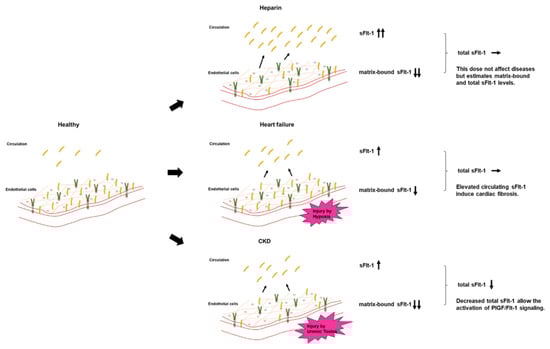 Both persistently high and low levels of sFlt-1 can be considered pathological and can result in arteriosclerosis and cardiac remodeling. These effects are due to the regulation of circulating free sFlt-1, matrix-bound sFlt-1, and total sFlt-1 (free plus matrix-bound sFlt-1) (Figure 6). CKD is characterized by the activation of a number of neurohumoral factors, including the renin–angiotensin–aldosterone system, the sympathetic nervous system, and proinflammatory cytokines such as uremic toxins, all of which lead to endothelial dysfunction []. Elevations of free sFlt-1 levels may result not from upregulated sFlt-1 production, but rather from the shifting of matrix-bound sFlt-1 to the circulation as a result of inflammatory endothelial injury in CKD and HF. A recent study showed that sFlt-1 mRNA expression in placental trophoblast cells was unchanged under hypoxic conditions, but sFlt-1 release into the media was significantly greater than under normoxic conditions []. A similar phenomenon may occur in ischemic endothelial cells in HF, given that endothelial cells, such as trophoblast cells, are a potential storage site for large amounts of sFlt-1 bound to extracellular heparan sulfate. Elevated sFlt-1 expressions in monocytes isolated from CKD patients and kidney transplantation patients were observed, but there may be other sources increasing free sFlt-1 levels [,]. Furthermore, total sFlt-1 is downregulated in the endothelium in CKD, which was confirmed by the finding that post-heparin sFlt-1 levels were decreased in CKD patients. Taken together, the regulation of increased free sFlt-1 levels and decreased total sFlt-1 levels can contribute to the development of atherosclerotic diseases and aggravation of HF in CKD patients.