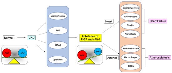 As schematically illustrated in Figure 7, we hypothesized that the balance between PlGF and sFlt-1 is disturbed when sFlt-1 is downregulated due to proposed triggers such as uremic toxins and reactive oxygen species in CKD patients, leading to the relative activation of atherogenic PlGF signaling through Flt-1. PlGF/Flt-1 signaling targets many cell types, including cardiomyocytes, endothelial cells, smooth muscle cells, macrophages, T cells, and fibroblasts []. In CKD it is likely that PlGF/Flt-1 signaling partly contributes to phenotypic changes of CKD such as ventricular hypertrophy and cardiac fibrosis with accumulation of macrophages and T cells in the heart, and smooth muscle cell proliferation and plaque formation in large arteries [,].