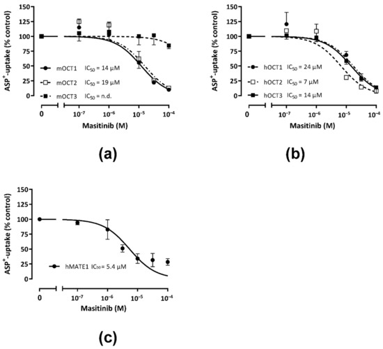 The graphs show the concentration-dependent inhibition of the initial ASP+ uptake by Masitinib in HEK293 cells stably expressing murine (panel (a)), or human (panel (b)) OCTs and human MATE1 (panel (c)). The y-axis displays the ASP+-uptake in % of control experiments without Masitinib (=100%). Values are mean ± SEM calculated in 18–50 replicates measured in at least 3 independent experiments. The IC50-values for each OCT are indicated in the inserts. Panel a shows the inhibition of ASP+ (1 µM) uptake by increasing Masitinib concentrations in HEK293 cells stably transfected with mOCT1- (closed dots), mOCT2- (open squares), or mOCT3 (closed squares). For mOCT3, the IC50-value could not be determined (n.d.), while Masitinib inhibited the ASP+ uptake by mOCT1 and mOCT2 with a similar apparent affinity (14 and 19 µM, respectively). Panel b shows the inhibition of ASP+ (1 µM) uptake by increasing Masitinib concentrations in HEK293 cells stably transfected with hOCT1- (closed dots), hOCT2- (open squares), or hOCT3 (closed squares). Masitinib inhibited the ASP+ uptake by hOCT1, hOCT2, and hOCT3 with a similar apparent affinity (24, 7, and 14 µM, respectively). Panel c shows the inhibition of ASP+ (1 µM) uptake by increasing Masitinib concentrations in HEK293 cells stably transfected with hMATE1- (closed dots). Masitinib inhibited the ASP+ uptake by hMATE1 with a high apparent affinity (5 µM).
