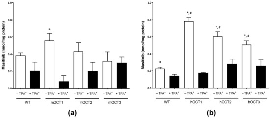Columns indicate Masitinib accumulation in WT- (n = 12) and m (panel (a)) or h (panel (b)) OCT1-3 stably expressing HEK293 cells in the presence (+ TPA+) or absence (− TPA+) of 1 mM of TPA+. Columns show the mean ± SEM of Masitinib uptake given as nmol Masitinib/mg protein measured in 9–12 replicates in 3 independent experiments. In panel a, * shows a statistically significant difference to experiments performed with mOCT1-expressing cells in the presence of 1 mM of TPA+ (unpaired t-test). In panel b, * shows a statistically significant difference to respective experiments performed in the presence of 1 mM of TPA+ (unpaired t-test), while # shows a statistically significant difference to WT without TPA+ (ANOVA with Tukey post-test).