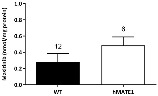 Columns indicate Masitinib temperature-dependent accumulation (accumulation measured at 37 °C minus accumulation measured at 4 °C) in WT- (n = 12) and hMATE1- (n = 6) HEK293 cells. Columns show the mean ± SEM of Masitinib uptake given as nmol Masitinib/mg protein measured in 12 and 6 replicates for WT- and hMATE1-HEK293 cells, respectively, in 3 independent experiments.