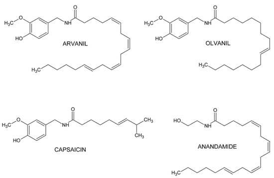 - Di Marzo, V.; Griffin, G.; De Petrocellis, L.; Brandi, I.; Bisogno, T.; Williams, W.; Grier, M.C.; Kulasegram, S.; Mahadevan, A.N.U.; Razdan, R.K.; et al. A Structure/Activity Relationship Study on Arvanil, an Endocannabinoid and Vanilloid Hybrid. J. Pharmacol. Exp. Ther. 2002, 300, 984–991. [Google Scholar] [CrossRef]