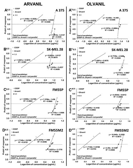 Marzęda, P.; Wróblewska-Łuczka, P.; Florek-Łuszczki, M.; Drozd, M.; Góralczyk, A.; Łuszczki, J.J. Comparison of the Anticancer Effects of Arvanil and Olvanil When Combined with Cisplatin and Mitoxantrone in Various Melanoma Cell Lines—An Isobolographic Analysis. Int. J. Mol. Sci. 2022, 23, 14192. https://doi.org/10.3390/ijms232214192