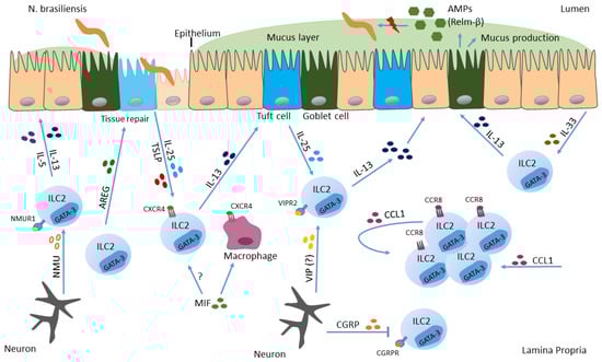 Peptides secreted from the enteric nervous system, such as NMU and VIP induce ILC2 effector function, which in turn improve protective immunity towards helminths [,,]. In contrast, calcitonin gene-related peptide (CGRP), which is also secreted from neurons (Figure 1) negatively regulates innate type 2 immunity in gut and lung [,,]. After infection with NB, ILC2s induce expression of CGRP and its receptor (CGRPR). Furthermore, CGRP was shown to act as negative regulator of ILC2 responses since type 2 cytokine production and proliferation of ILC2s was decreased in response to CGRP in vitro and in vivo, indicating that neuron-derived products can be both, activators and inhibitors of ILC2 responses [].