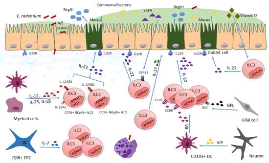 ILC3s reacting to C. rodentium invasion. Upon CR infection cytokines such as IL-23 and IL-1β are released, activating ILC3s to secrete IL-22. Thereafter, antimicrobial peptides (AMPs) are secreted (e.g., RegIII), which limits CR infection. RegIII secretion of intestinal epithelial cells is mediated via ILC3-derived IL-22. Transcription factors such as IRF-1 can control ILC3 numbers. Additionally, VIP secreted by neurons, induces CD103+ dendritic cell secretion of RA, required for ILC3 homing to the intestine. Furthermore, by release of IL-7, LTβR+ FRCs are required for sustenance of ILC3 numbers, which is important for mounting proper host defense against CR.