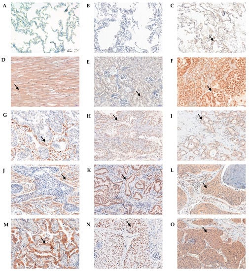 Immunohistochemical reactions (IHC) indicating lack of irisin (A) and ERRα (B) expression. Weak positive IHC reaction for PGC-1α (C) in non-malignant lung tissue (NMLT). Positive cytoplasmic IHC reaction indicating irisin expression in skeletal muscle (positive control—D). Irisin expression in NSCLC cancer cells and stromal cells (grade of malignancy G1—G, G2—J, G3—M). Nuclear expression of ERRα in kidney (positive control—E). ERRα expression in NSCLC cancer cells (G1—H, G2—K, G3—N). Positive cytoplasmic expression of PGC-1α in prostate (positive control—F). PGC-1α in NSCLC cancer cells and stromal cells (G1—I, G2—L, G3—O). Magnification ×200. Arrows indicate a positive reaction.