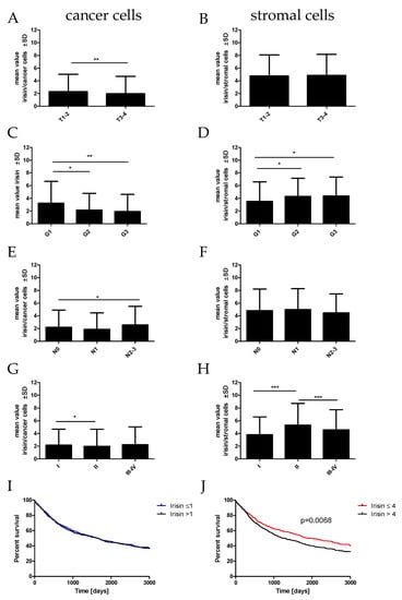 Comparison of irisin expression levels detected by immunohistochemistry (IHC) in NSCLC (n = 860) cells (A,C,E,G) and in stromal cells (B,D,F,H) according to the tumor size (A,B), malignancy grade (C,D), lymph node status (E,F), and tumor stage (G,H), * p ≤ 0.05, ** p ≤ 0.005, *** p ≤ 0.001. Kaplan–Meier survival curves show the prognostic impact of irisin expression levels in cancer cells (I) and stromal cells (J) on overall survival (OS) in patients with NSCLC. Patients were grouped according to the median value of expression levels.