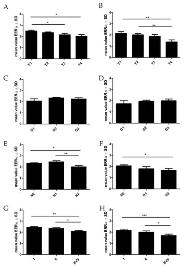 Comparison of ERRα receptor expression levels detected by immunohistochemistry (IHC) in non-small cell lung cancer NSCLC (n = 860, A,C,E,G) and adenocarcinoma subtype—AC (n = 344, B,D,F,H) according to the tumor size (A,B), the grade of malignancy (C,D), the lymph node status (E,F), and the tumor stage (G,H), * p ≤ 0.05, ** p ≤ 0.005, *** p ≤ 0.001.