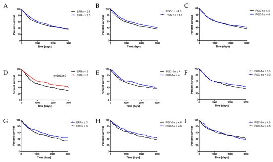 Kaplan–Meier survival curves show the prognostic impact of ERRα expression levels on overall survival (OS) in patients with NSCLC (A), AC (D), SCC (G). Kaplan–Meier survival curves show the prognostic impact of PGC-1α expression levels in cancer cells on overall survival (OS) in patients with NSCLC (B), AC (E), SCC (H). Kaplan–Meier survival curves show the prognostic impact of PGC-1α expression levels in stromal cells on overall survival (OS) in patients with NSCLC (C), AC (F), SCC (I). Patients were grouped according to the median value of expression levels.