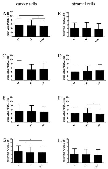 The statistical analyses of the relationship between PGC1α found in cancer cells and stromal cells with clinical and pathological factors in NSCLC are given in Figure 5 and Table 3. We observed a decreased level of PGC-1α expression in cancer cells with an increase in tumor size (T) (Kruskal–Wallis test, p = 0.0064). Significant differences were found between T1 vs. T3-T4 (p = 0.0027) and T2 vs. T3-T4 (p = 0.0144). Moreover, PGC1α expressed in cancer cells decreased in advanced stages of the disease (Kruskal–Wallis test, p = 0.0339). PGC-1α expression levels significantly decreased in SII vs. SI (p = 0.0482) and in SIII-IV vs. SI (p = 0.0173).