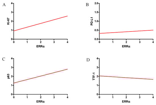 Correlations of ERRα receptor expression levels with diagnostic markers were strong positive—Ki-67 (A), moderate positive—EGFR (B), moderate positive—p63 (C) and weak positive—PD-L1 (D) in NSCLC (n = 860).