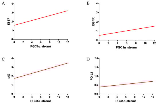 Correlations of PGC-1α expression levels in stromal cells with diagnostic markers were moderate positive—Ki-67 (A), weak positive—EGFR (B), weak positive—p63 (C) and weak positive—PD-L1 (D) in NSCLC (n = 860).