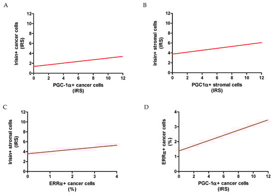 Correlations between irisin expressed in cancer cells with PGC-1α expressed in cancer cells (A) and stromal cells with PGC-1α (stromal cells) (B), and ERRα receptor (C). Correlations between ERRα and PGC-1α in NSCLC (n = 860) cancer cells (D).