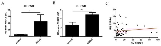 Comparison between control (n = 16) and NSCLCs (n = 56) of FNDC5 mRNA (A) and ESRRA mRNA (B) expression levels. The moderate positive correlation between mRNA FNDC5 and mRNA ESRRA expression levels in NSCLC patients (C), * p ≤ 0.05, ** p ≤ 0.005.