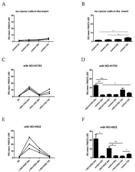 Comparison of the expression level of FNDC5 mRNA after co-culture in IMR-90 cells in the empty insert (control) (A,B) and the insert with lung cancer cells [NCI-H1703 (C,D) and NCI-H522 (E,F)], * p ≤ 0.05, ** p ≤ 0.005, *** p < 0.001.
