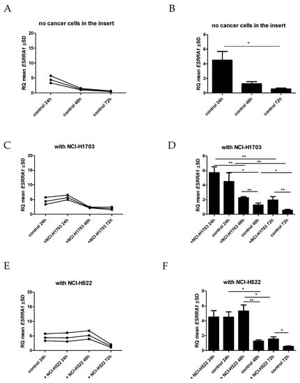 Comparison of the expression level of ESRRA mRNA after co-culture in IMR-90 cells in the empty insert (control) (A,B) and the insert with lung cancer cells [NCI-H1703 (C,D) and NCI-H522 (E,F)], * p ≤ 0.05, ** p ≤ 0.005.