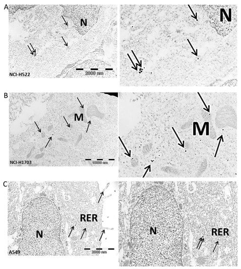 Positive immunogold reaction (black dots—indicated by arrows) point to irisin/FNDC5 expression in the cell cytoplasm in NCI-H522 cells—magnification on the right (A), in NCI-H1703 cell mitochondria-M membrane—magnification on the right (B), in rough endoplasmic reticulum-RER and in cytoplasmic extensions of A549 cell (C), N-nucleus, magnification ×25,000.