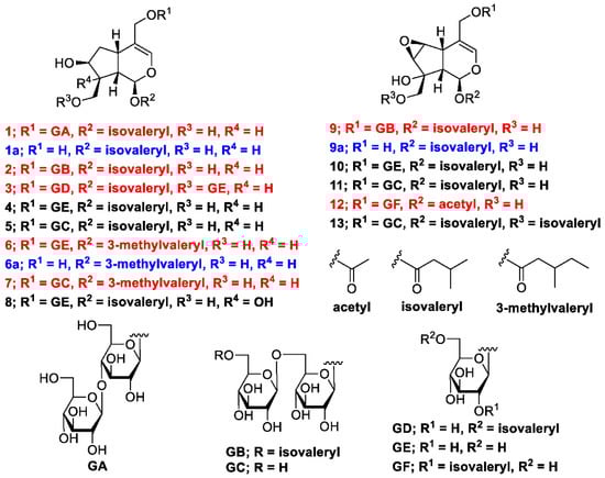 - Nishiya, K.; Kimura, T.; Takeya, K.; Itokawa, H. Sesquiterpenoids and Iridoid Glycosides from Valeriana fauriei. Phytochemistry 1992, 31, 3511–3514. [Google Scholar] [CrossRef]